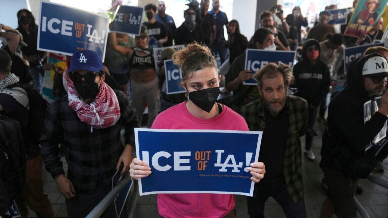 “ICE out of Paramount. We see you for what you are,” a woman said through a megaphone. “You are not welcome here.”