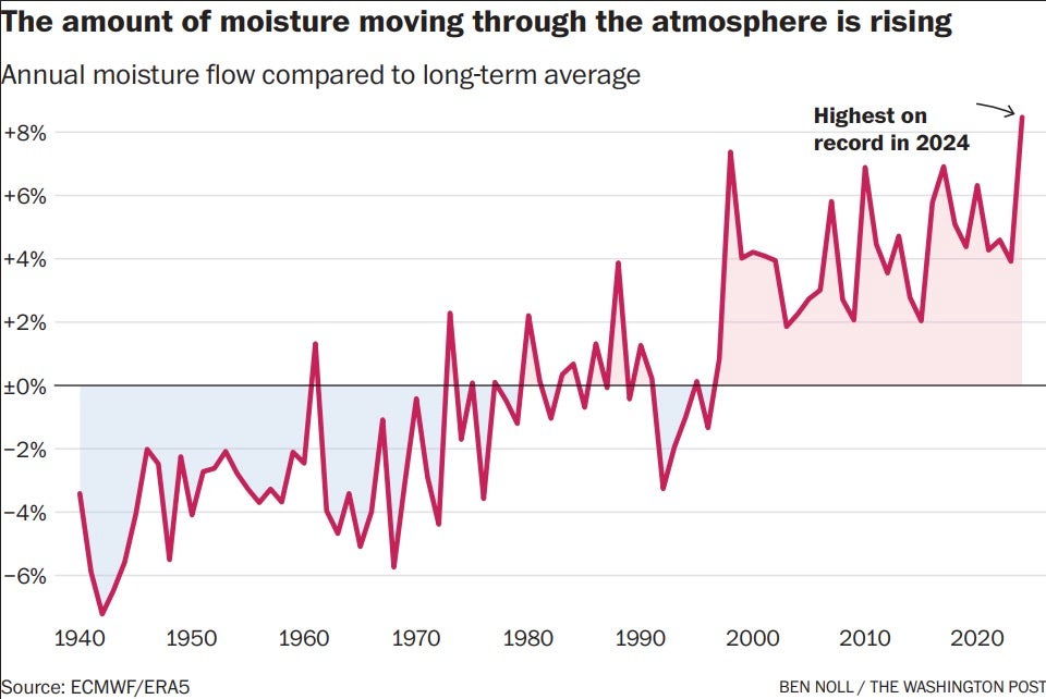 From last year’s disaster in Asheville to this month’s catastrophic floods in Central Texas, the world has entered a new era of rainfall supercharged by climate change, rendering existing response plans inadequate. A Washington Post analysis of atmospheric data found a record amount of moisture flowing in the skies over the past year and a half, largely due to rising global temperatures. With so much warm, moist air available as fuel, storms are increasingly able to move water vapor from the oceans to locations hundreds of miles from the coast, triggering flooding for which most inland communities are ill-prepared.