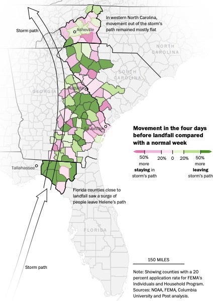 But in western North Carolina, travel out of the 16 hardest-hit counties remained flat, suggesting that most residents were hunkering down in the four days before the storm. Buncombe County, where 43 people were killed, saw a modest 12 percent increase in outbound movement.