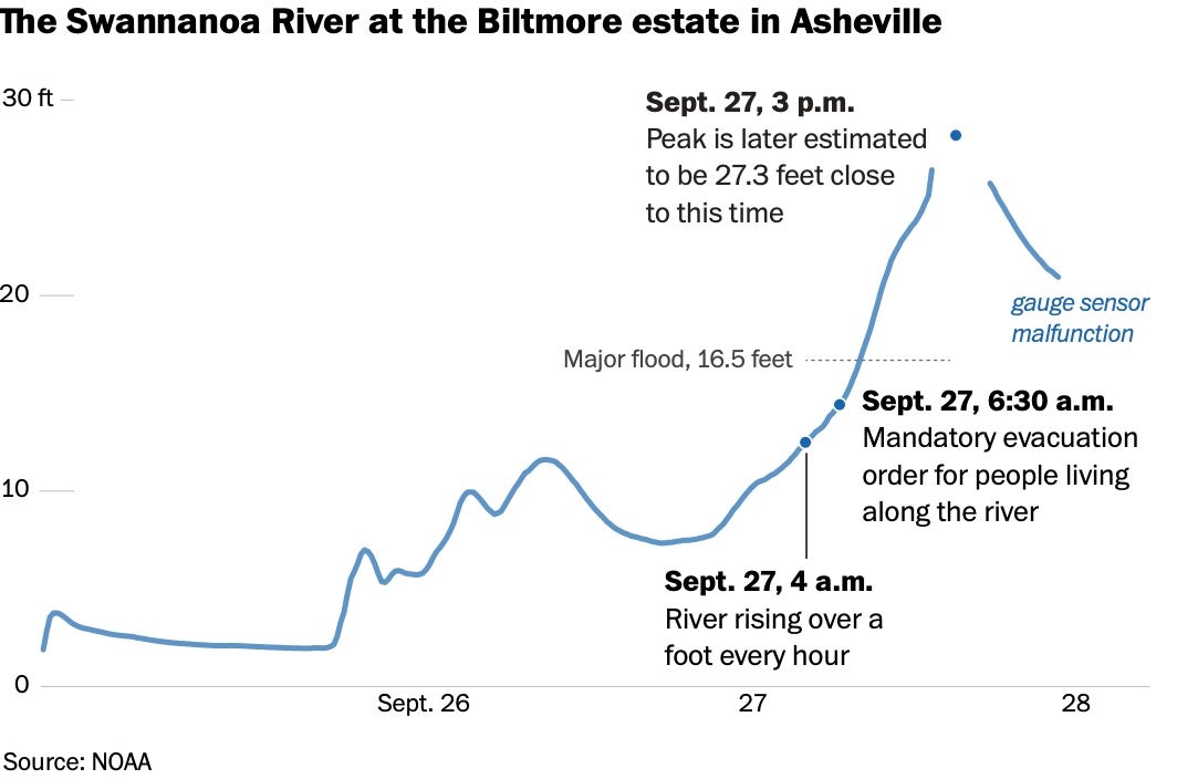 By that point, the Swannanoa was rising by nearly a foot every hour, according to a federally maintained gauge six miles downstream from Newman’s apartment complex.