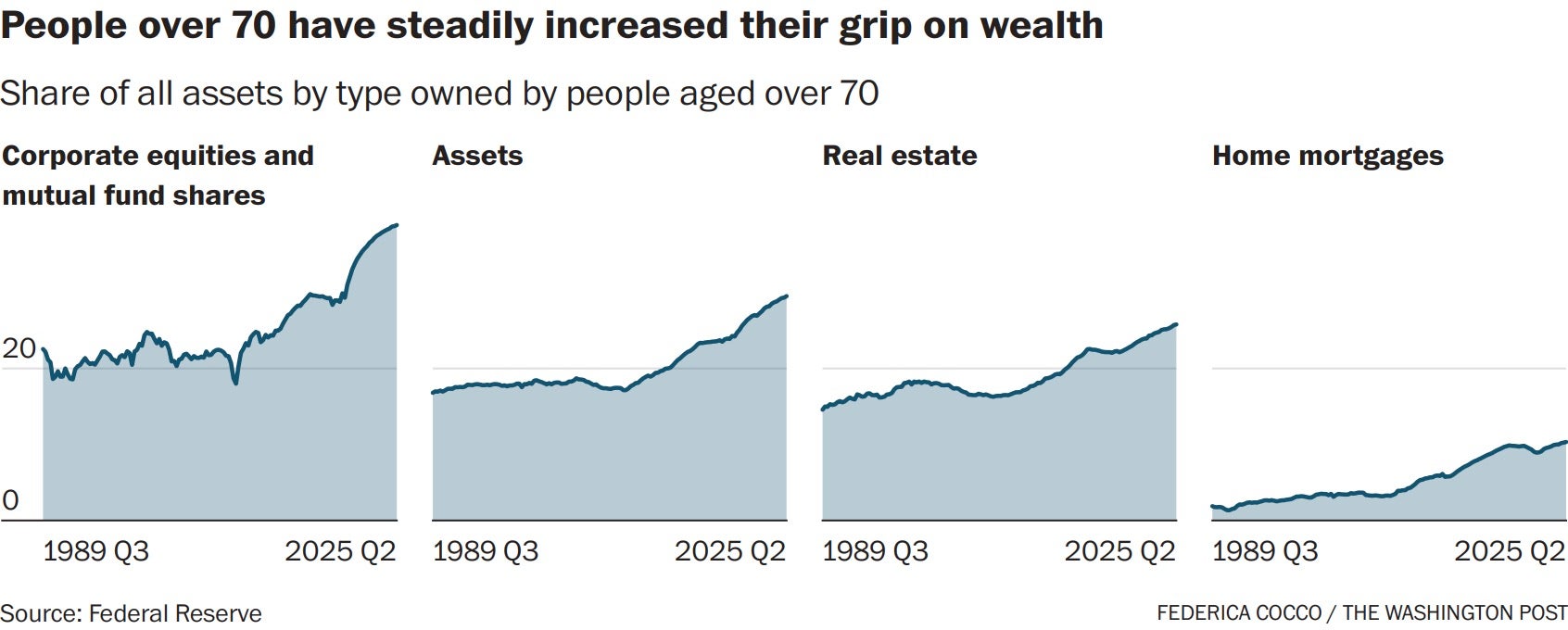 The reasons come down to timing and time: Americans 75 and older bought homes and invested in stocks well before such assets exploded in value, according to Edward Wolff, an economics professor at New York University. In a working paper for the National Bureau of Economic Research, he examined the four decades between 1983 and 2022 when those older boomers’ saw their wealth climb and their younger peers recorded relative declines.