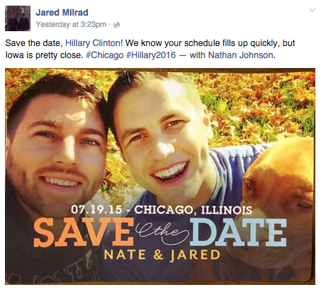 Two of the stars of her presidential campaign announcement are Nathan Johnson and Jared Milrad, who were featured to highlight the Democratic presidential contender’s support of same-sex couples. The former Boston students and longtime supporters of Clinton want to repay her by inviting her to their big day.