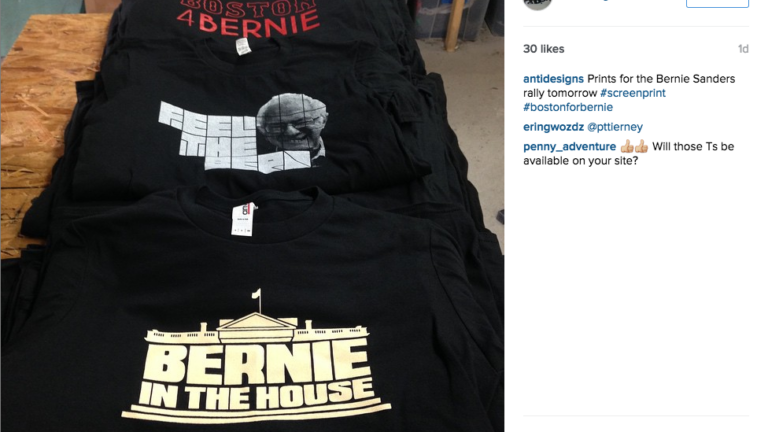 At that event, the print-making company Antidesigns was hired to do live-printing of Bernie-related shirts. Jay LaCouture, the founder of Antidesigns, said they created four designs out of the “seven or eight’’ concepts that Boston for Bernie had suggested.