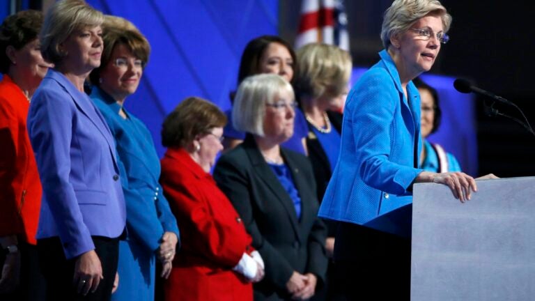 Warren joined other women senators on stage: Maryland’s Barbara Mikulski, Washington’s Patty Murray, Michigan’s Debbie Stabenow, Washington’s Maria Cantwell, Minnesota’s Amy Klobuchar, Missouri’s Claire McCaskill, New Hampshire’s Jeanne Shaheen, New York’s Kirsten Gillibrand, Wisconsin’s Tammy Baldwin, Hawaii’s Mazie Hirono, and California’s Barbara Boxer.