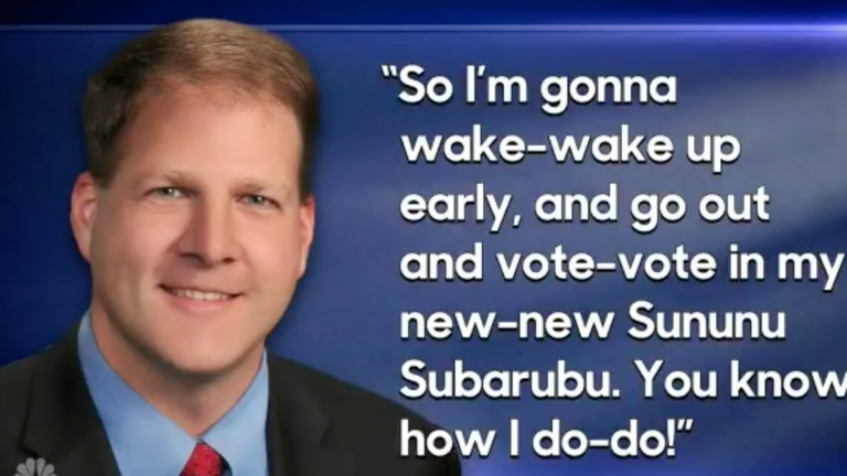 “Sununu actually had a lot to say about it,” Fallon continued. “First, Sununu said ‘I know the weather makes everyone feel blue-blue. But a little snow-snow shouldn’t stop me and you-you.’ Then Sununu said, ‘So I’m gonna wake-wake up early, and go out and vote-vote in my new-new Sununu Subarubu. You know how I do-do.'”