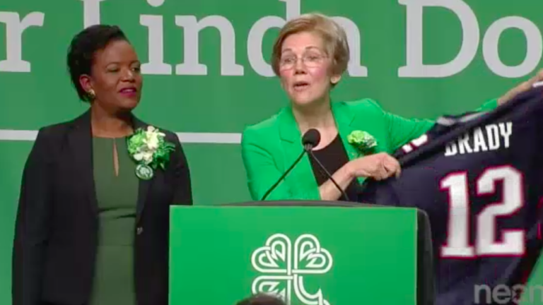 “Wasn’t it great to see a victory that wasn’t decided by the Russians,” she said, calling for Congress to investigate Trump’s ties to the country— only after they figured out what happened to Tom Brady’s game jersey. In fact, Warren announced that she had made progress on the latter.
