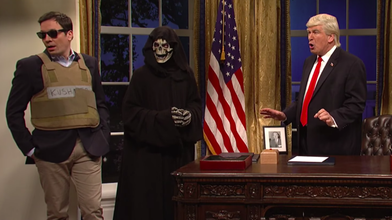 Bannon, Trump’s chief strategist, was again portrayed on the show as the Grim Reaper. Kushner, Trump’s son-in-law and senior adviser, was played by last night’s SNL host, Jimmy Fallon (dressed in the same flak-jacker-and-blazer outfit Kushner was mocked for wearing last week while visiting troops in Iraq).
