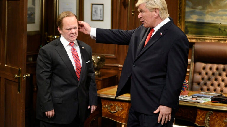 “Only since you started working here,” says Trump, played by Alec Baldwin. He maintains that he won’t fire Spicer, before playfully tickling him.