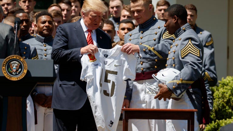 Trump saluted the Black Knights with the annual Commander-in-Chief’s Trophy on Tuesday, recounting their victory over Navy on a snowy day in Philadelphia. He received a white Army jersey. It’s the first Commander-in-Chief Trophy for West Point since 1996.