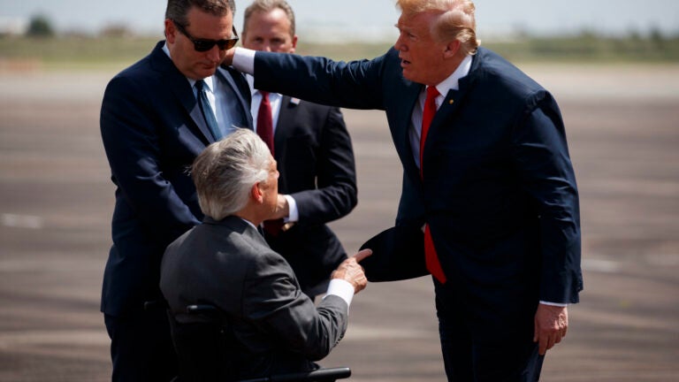 Texas Gov. Greg Abbott and Sen. Ted Cruz, both Republicans, greeted Trump after Air Force One landed at a Houston military base. Abbott joined Trump for the short ride in the presidential limousine to a Coast Guard hangar where the meeting took place.