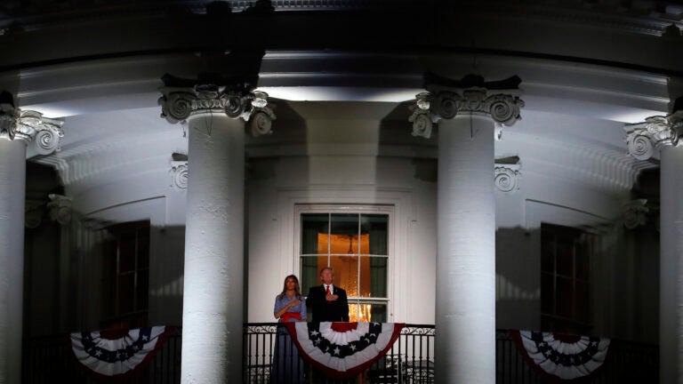 Trump and the first lady later returned to the balcony toward the end of a nationally televised concert from the South Lawn and stayed for the annual fireworks show on the National Mall. Trump pumped both fists several times at the end of the show before he went back inside the White House.