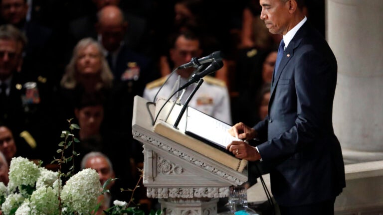 Obama spoke after former President George W. Bush, another former McCain opponent. Obama said of McCain, “He made us better presidents.”