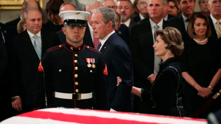 Political combatants set aside their fights to honor a Republican who led in a less toxic era and at times found commonality with Democrats despite sharp policy disagreements. Democratic Rep. Nancy Pelosi, past and incoming House speaker, exchanged a warm hug with George W. Bush and came away dabbing her face. Bush himself seemed to be holding back tears.