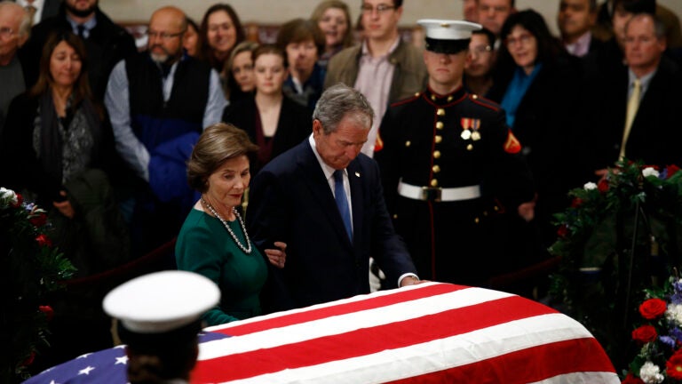 George W. and Laura Bush entered first, and the former president put his hand on the flag-draped casket holding the remains of his father. Their twin daughters, Jenna and Barbara, followed. Jeb Bush and his wife joined along with about a dozen other members of the Bush family. They mingled for about 10 minutes, at one point George W. Bush held up a baby.
