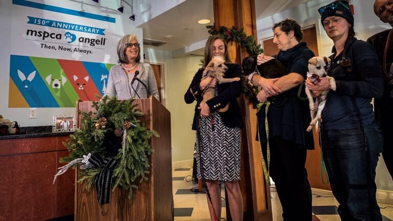 The Melrose Democrat’s proposal was co-sponsored by more than half of the House — 188 Democrats and 62 Republicans — and was endorsed by a coalition of domestic violence and animal welfare advocates, including the MSPCA-Angell, which hosted Tuesday’s event with a handful of shelter dogs looking for a home at their medical center in Waltham.
