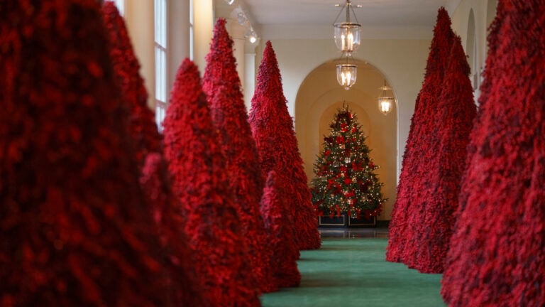 Melania Trump’s red topiary trees a hit at Christmas parties