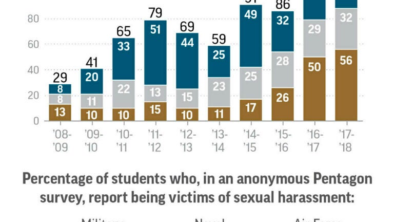 Sexual harassment — against both men and women — also increased at West Point and the Naval Academy, and against men at the Air Force Academy. Women at the Air Force Academy saw a slight dip in harassment.