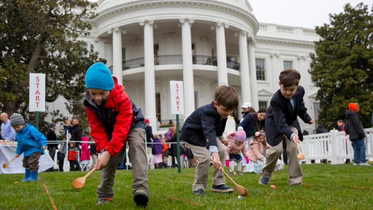 Families with children ages 13 and younger are invited to join President Donald Trump and first lady Melania Trump for a day of festivities on the South Lawn, where children use wooden spoons to roll dyed hard-boiled eggs.
