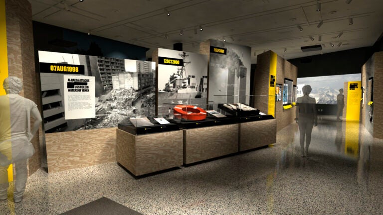 In other images, American military personnel huddle in strategy sessions and outside on terrain being searched. Visitors will see trunks containing items gathered during various U.S. raids of al-Qaida locations that might have yielded evidence of bin Laden’s whereabouts.
