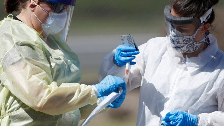 FILE - In this Tuesday, March 31, 2020 file photo, medical technicians handle a vial containing a nasal swab at a drive-thru testing site in Wheat Ridge, Colo., as a statewide stay-at-home order remains in effect in an effort to reduce the spread of the COVID-19 coronavirus. Home testing for coronavirus may sound like a good idea, but As of early April 2020, U.S. regulators say it's still too risky. (AP Photo/David Zalubowski) The Associated Press