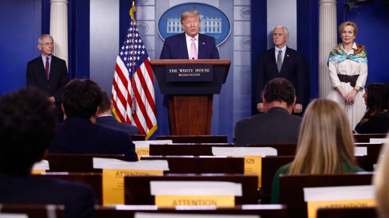 Joining Trump were Vice President Mike Pence, virus task force coordinator Dr. Deborah Birx, and Dr. Anthony Fauci, the U.S. government’s foremost infection disease expert. Each stood far apart from one another on the small stage.
