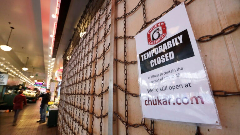 FILE - In this Thursday, April 2, 2020 file photo a sign explains the closure of a shop in the Pike Place Market in Seattle. As the coronavirus outbreak has caused record number of people to seek unemployment benefits Washington state officials said Thursday that impostors have used the stolen information of tens of thousands of people to receive hundreds of millions of dollars in unemployment benefits. (AP Photo/Elaine Thompson,File) The Associated Press