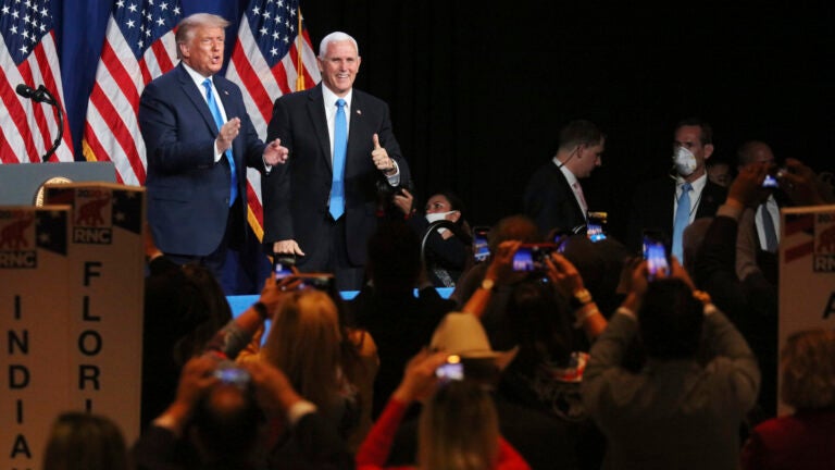 President Donald Trump and Vice President Mike Pence after speaking during the first day of the Republican National Convention, Monday, Aug. 24, 2020, in Charlotte, North Carolina. Travis Dove / The New York Times via AP, Pool