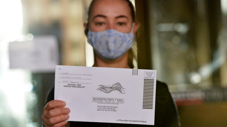 A woman holds up a mail-in ballot before dropping it off at Boston City Hall during the Massachusetts primary in Boston Tuesday. JOSEPH PREZIOSO/AFP via Getty Images