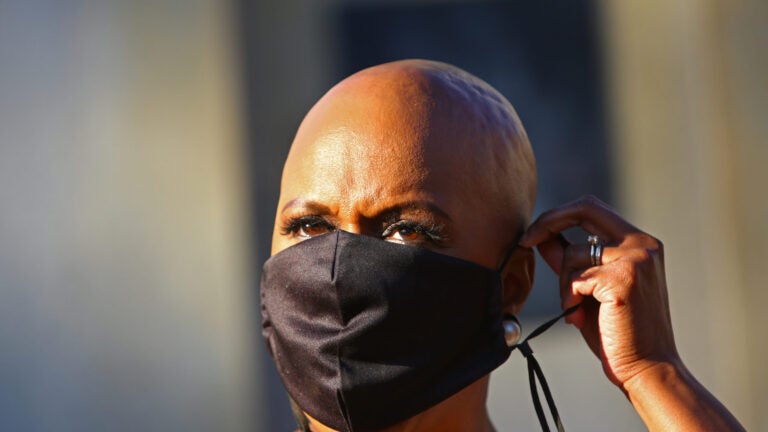 Rep. Ayanna Pressley puts on a mask after speaking at a press conference last month in front of the Massachusetts State House in Boston. Pat Greenhouse / The Boston Globe