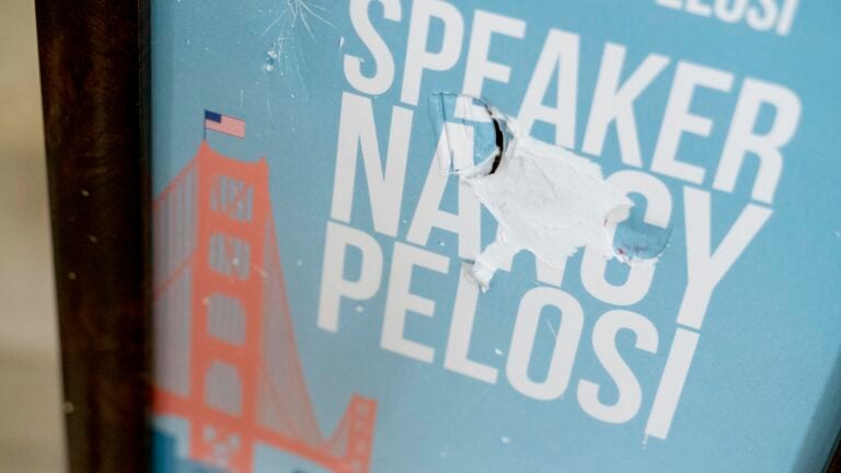The sign in front of the office of Speaker of the House Nancy Pelosi, D-Calif., is damaged as seen in the early morning hours at the Capitol in Washington, Thursday, Jan. 7, 2021, after protesters stormed the Capitol. (AP Photo/Andrew Harnik)