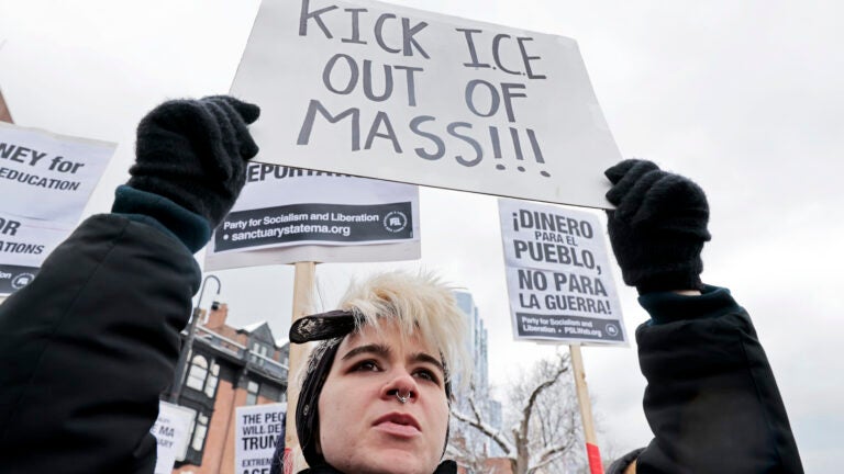 Protesters gathered outside the State House in Boston earlier this month to show their support for sanctuary policies and disdain for federal immigration authorities. Pat Greenhouse/Boston Globe