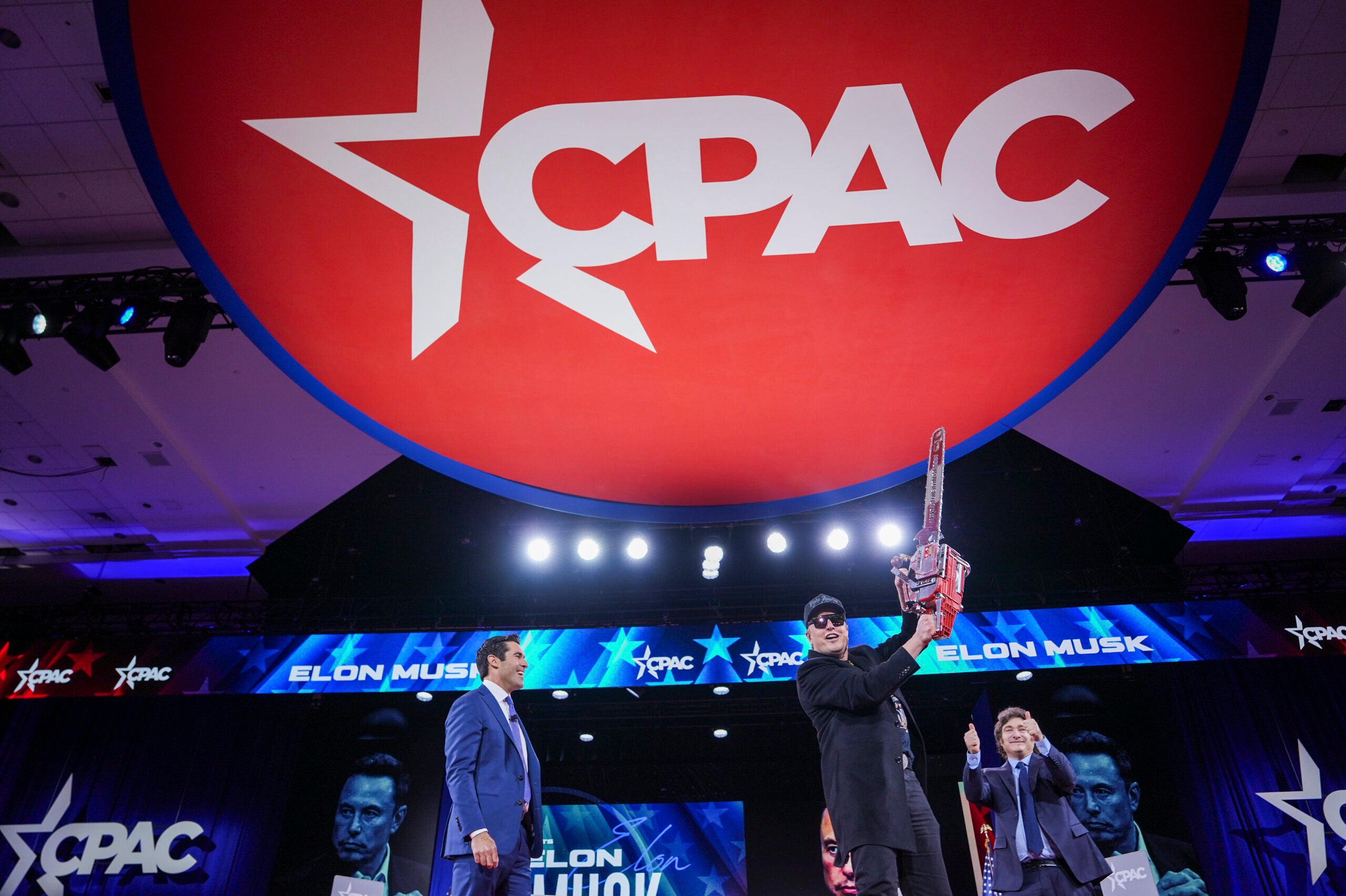 As he walked onto the stage, he was handed a chain saw from one of his political allies, Javier Milei, the president of Argentina. “This is the chain saw for bureaucracy!” Musk shouted to the cheering crowd.