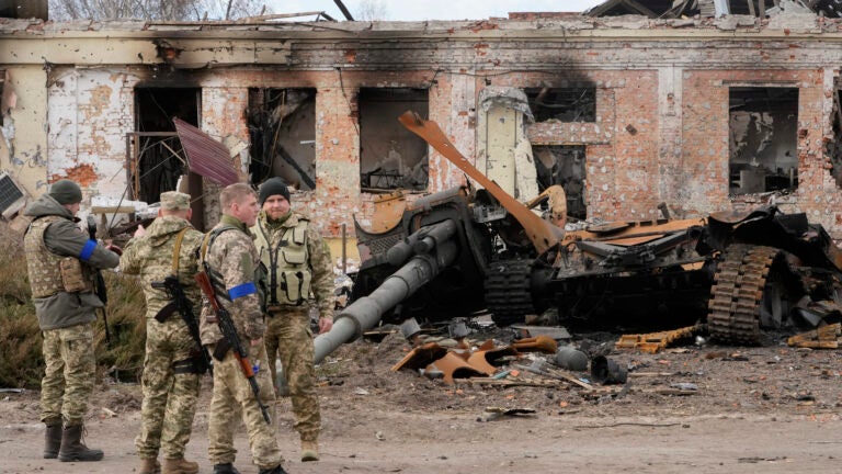 Arriving in the town Monday shortly afterward, The Associated Press saw the bodies of two Russian soldiers lay abandoned in the woods and Russian tanks lay burned and twisted. A red “Z” marked a Russian truck, its windshield fractured, near stacked boxes of ammunition. Ukrainian forces piled atop a tank flashed victory signs. Dazed residents lined up amid charred buildings seeking aid.