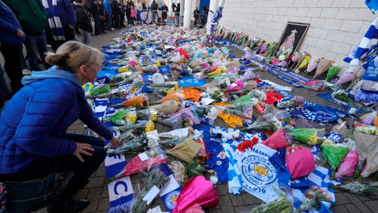 LEICESTER, England (AP) — Flowers and wreaths were laid outside Leicester City’s stadium on Sunday as investigators looked into the circumstances behind a helicopter, belonging to the English club’s Thai owner, crashing in flames next to the ground.