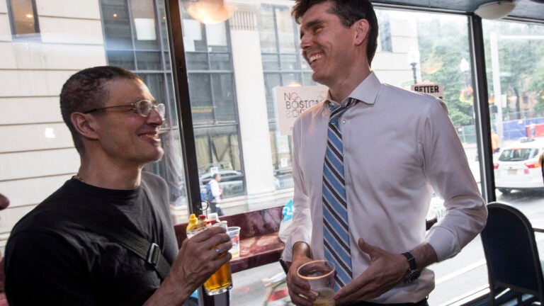 Chris Dempsey, one of the three co-chairs of the group No Boston Olympics, made his way around the room, smiling and shaking the hands of his supporters. Each time he finished one conversation, someone else came to shake his hand, eagerly thanking and congratulating him. Throughout the evening, he took a few moments to himself, sinking into a booth in the back of the room to check his cell phone or talk briefly to his co-chair Kelly Gossett. They looked tired, but happy.