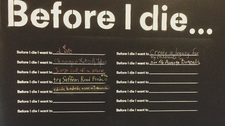 Though a blank wall asking such a question may be intimidating, it filled up quickly with everything from the broad (“Live’’) to the specific (“I want my girls to know how much I love them’’).