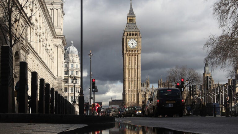 A puddle reflected Big Ben’s clock tower, following a heavy downpour on March 7.