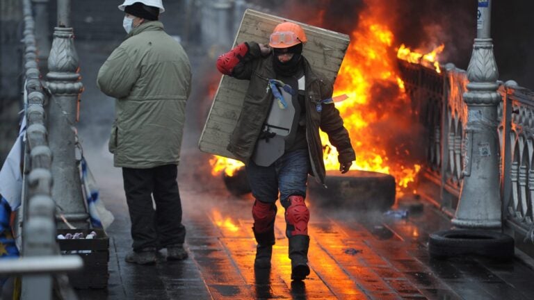 A demonstrator wears a gas mask behind a barricade near Kiev’s Independence Square, known as Maidan.