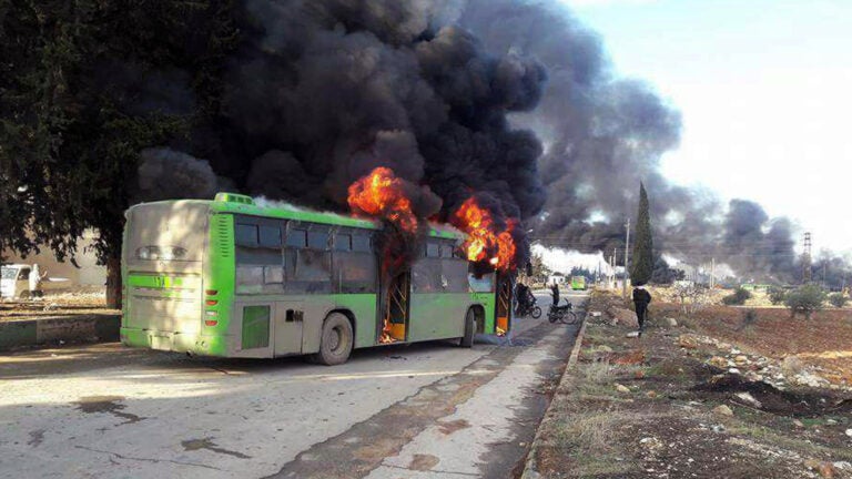 Earlier Sunday, pro-Syrian government TV stations showed dozens of buses on stand-by at a crossing near eastern Aleppo, reportedly poised to resume evacuations from the opposition’s last foothold in the city.