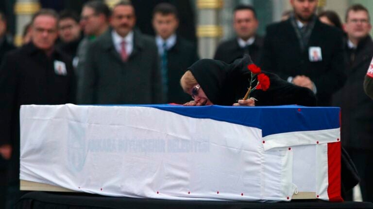 Karlov’s body was flown home to Moscow on Tuesday afternoon after an emotional ceremony at Ankara Airport attended by Turkish government officials and diplomats. Karlov’s wife, Marina Karlova, wept as her husband’s flag-draped coffin was carried by a Turkish honor guard. She laid two red carnations on the coffin before it was loaded onto the aircraft.