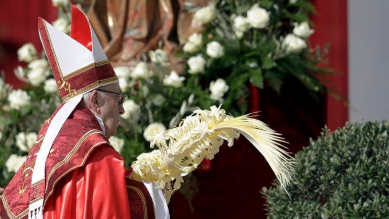 At the end of Mass, the pope and cardinals in red robes led a solemn procession clutching elaborately braided palm fronds as they walked through the throngs, followed by the papal blessing of palm fronds and olive branches.