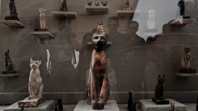 SAQQARA, Egypt (AP) — A top Egyptian antiquities official says local archaeologists have discovered seven Pharaonic Age tombs near the capital Cairo containing dozens of cat mummies along with wooden statues depicting other animals and birds.