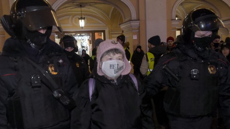 Footage from reporters in Russia showed a large police presence at demonstrations across the country, many clad in riot gear or driving armored trucks. Journalists with Western outlets – citing Russia’s newly-passed law restricting discussion of the invasion – spoke elliptically about the “situation” in Ukraine as they narrated protesters’ arrests.