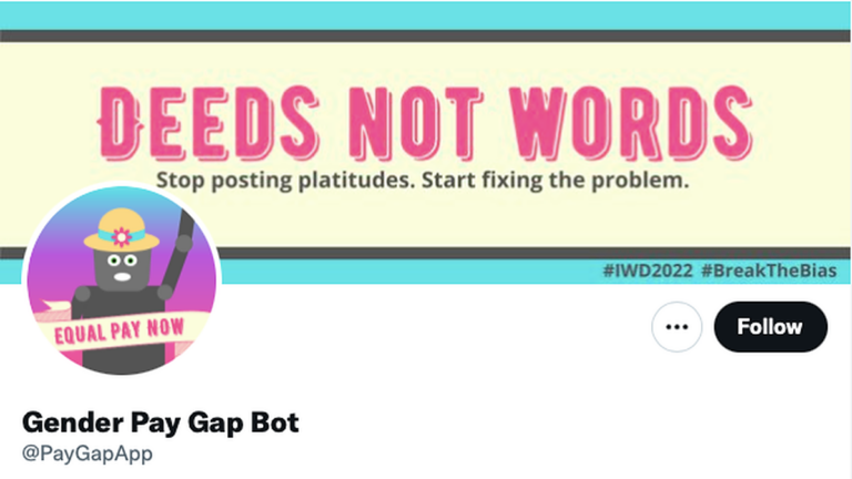 Fensome, a software developer, built the account as a bot, writing code that leads it to perform the function listed in its Twitter bio: “Employers, if you tweet about International Women’s Day, I’ll retweet your gender pay gap,” it warns.