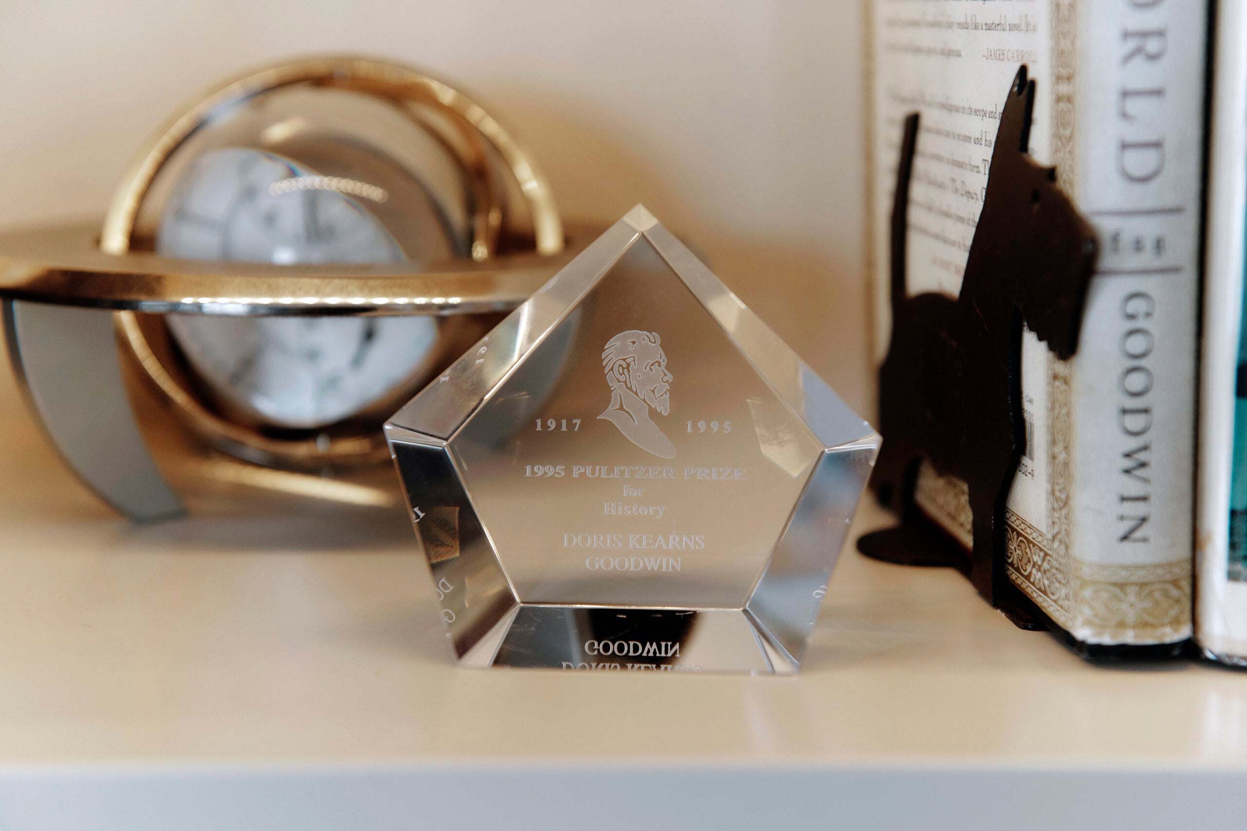 Other pieces from the Concord house are scattered around the apartment — among them, several Persian rugs and an octagonal Indian coffee table. The bookcase that was in her old foyer sits in the condo’s entryway. Now, as then, it contains first editions and a miniature reproduction of the Revolutionary War Battle of Lexington and Concord, on the North Bridge. Sometimes her 5-year-old grandson plays with the toy soldiers, Kearns Goodwin said, as she adjusted the orientation of the tiny bridge.