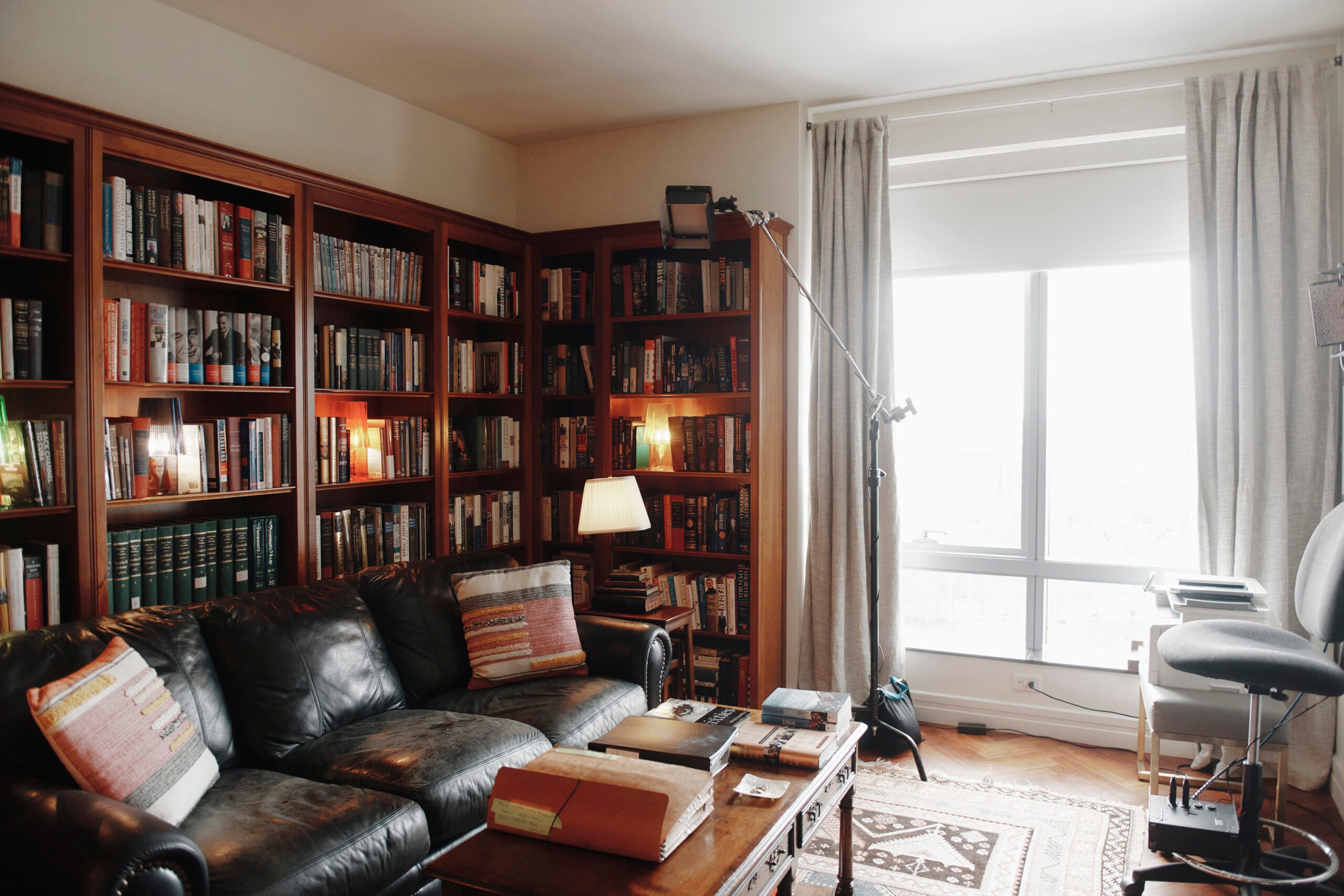 She had the source material, but she also needed the setting: a re-creation of her Concord study in her new condo. The mise en scene included a nicely worn blue leather sofa, a low chestnut table with plenty of room for books, a side table and the rug that Kearns Goodwin brought back from Morocco when she attended the 40th anniversary of the Casablanca Conference, a 1943 meeting between President Franklin D. Roosevelt and British Prime Minister Winston Churchill.