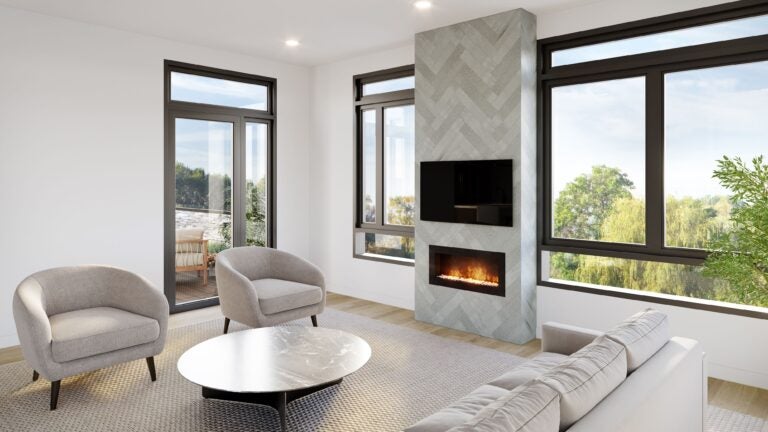 The living room will offer an electric fireplace and expansive windows.
