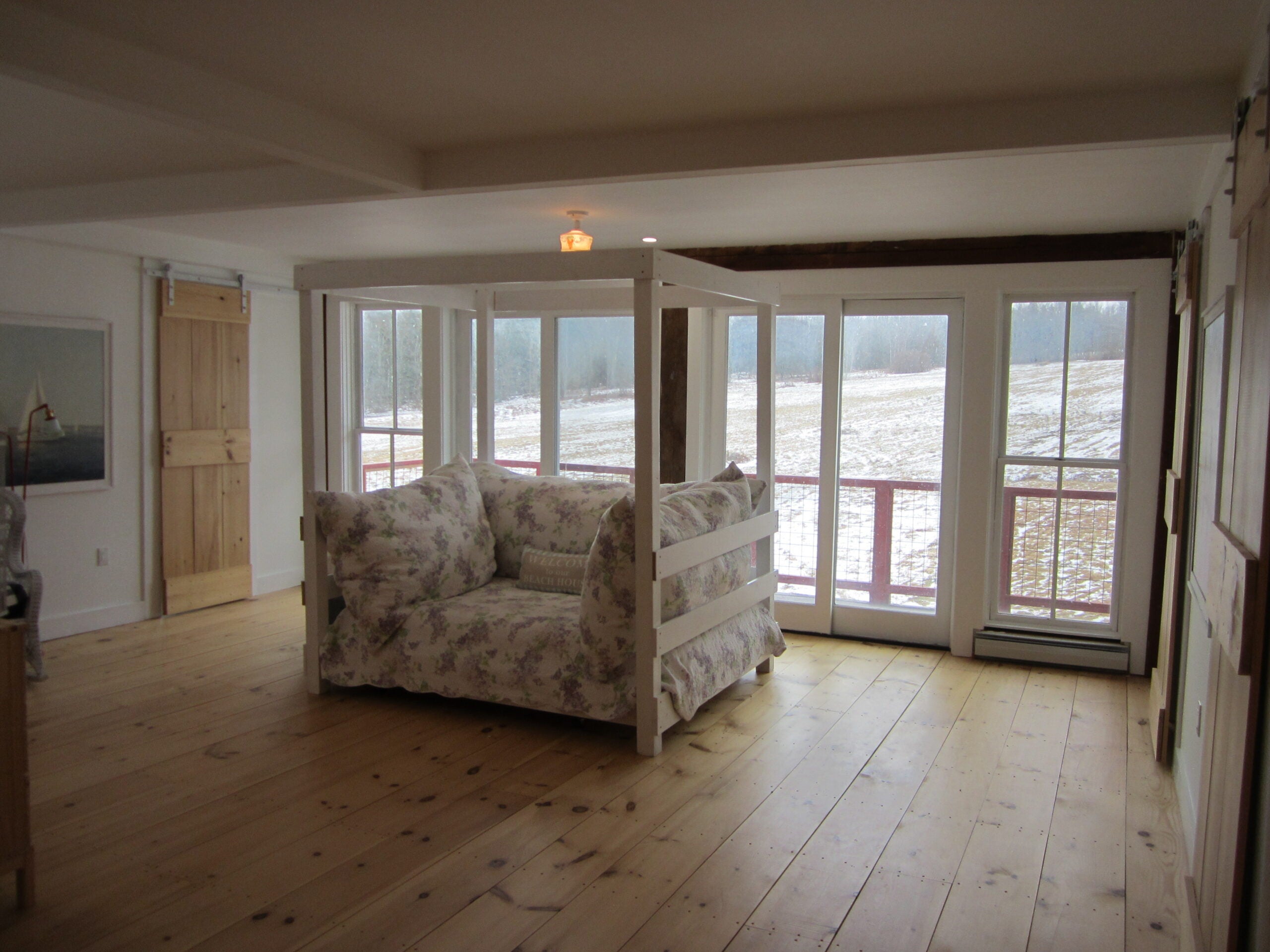 Continue up to the third-level guest space, boasting the same bright white floors and walls as the first floor. It features six dormers, eight closets, a cupola, and sliding doors leading out to the home’s third and fourth decks overlooking the pastures and meadows. The third level has a bathroom with a shower.
