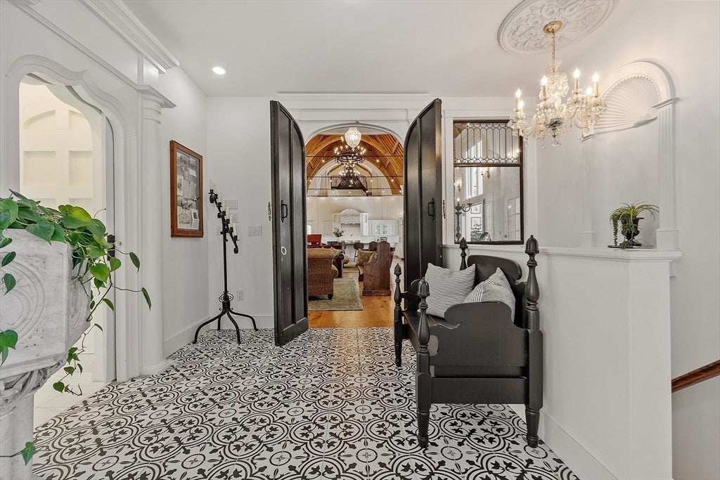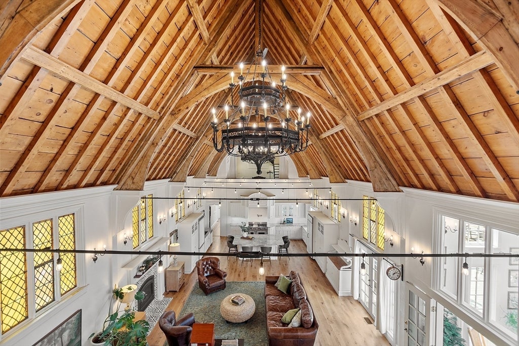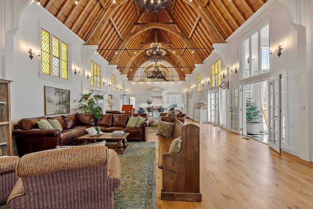 If you’re looking to make the former church your home, you can step inside the large front door to a vestibule with two double doors. Continue into the grand hall, the church’s former nave featuring towering wood ceilings and stained glass windows. The 1,225-square-foot space has a cozy fireplace, while the choir loft above maintains its architectural grandeur.