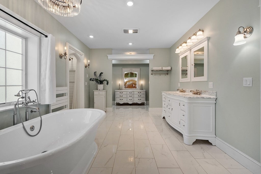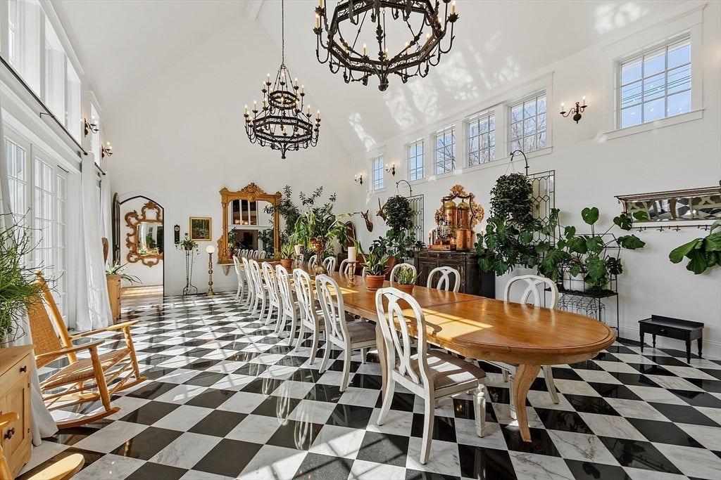A major addition includes the sprawling 619-square-foot dining room off the grand hall, where black-and-white checkered white marble and black granite flooring, and several sets of French doors that stream in natural light. It leads out to a 672-square-foot deck.